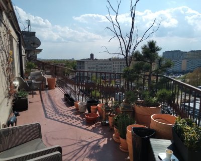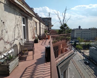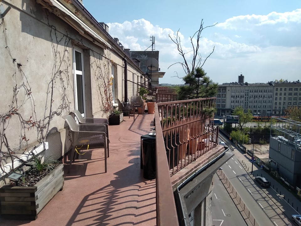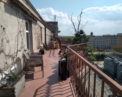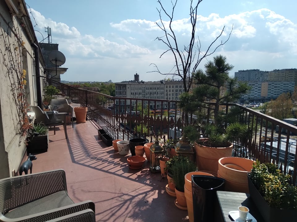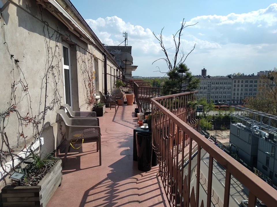 Wydłużony kształt balkonu w zabytkowej kamienicy z wydzielonym miejscem na obiadowy komplet mebli. Świetna lokalizacja w centrum miasta, widok na kontrastową zabudowę nowoczesną w połączeniu z dachami przedwojennych kamienic.