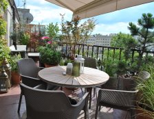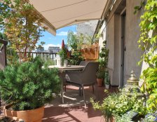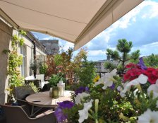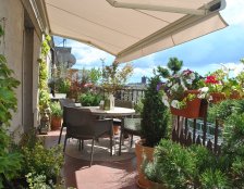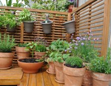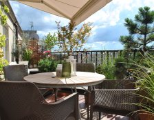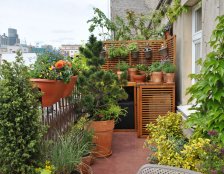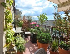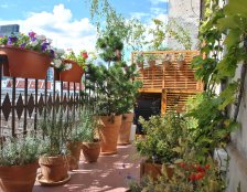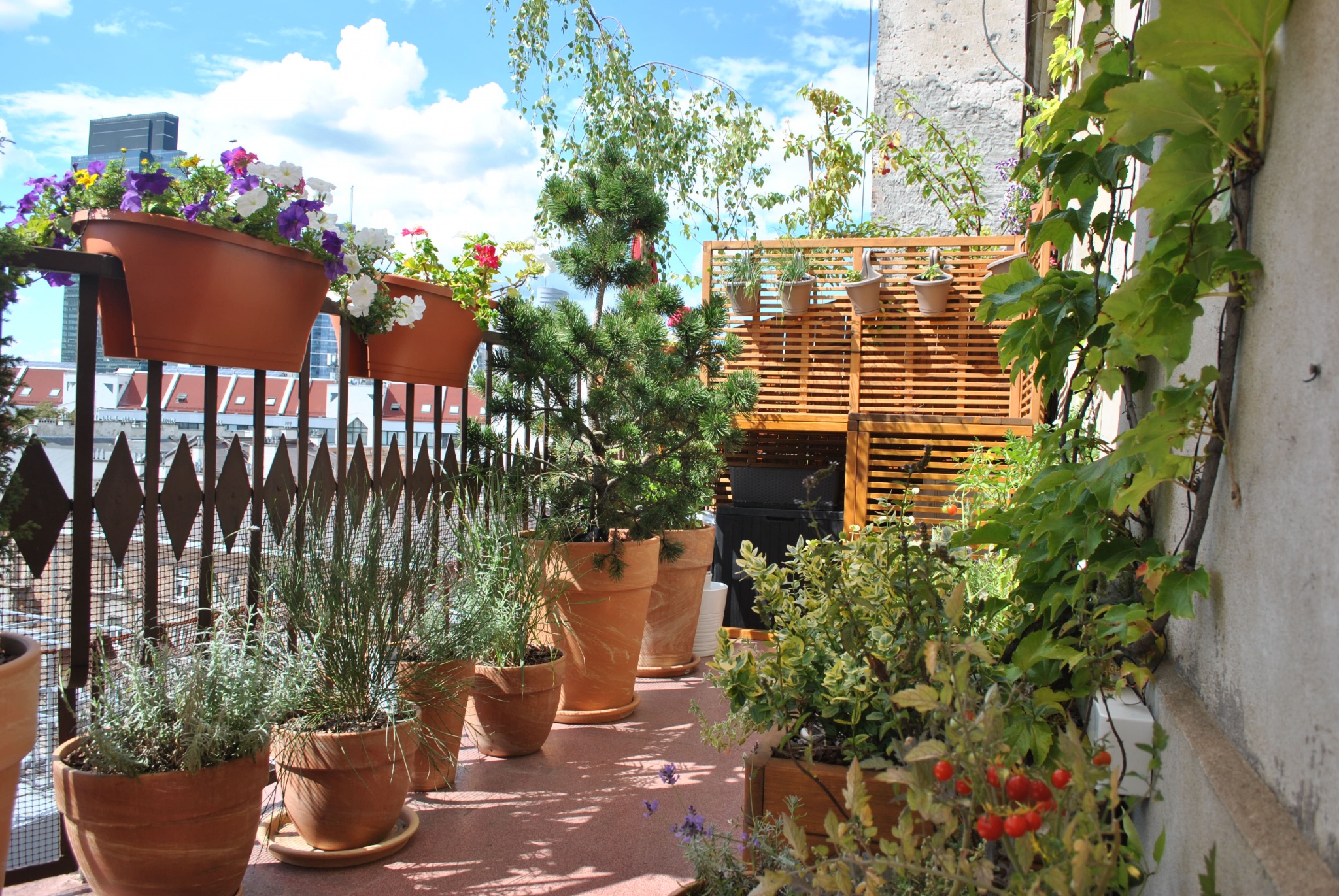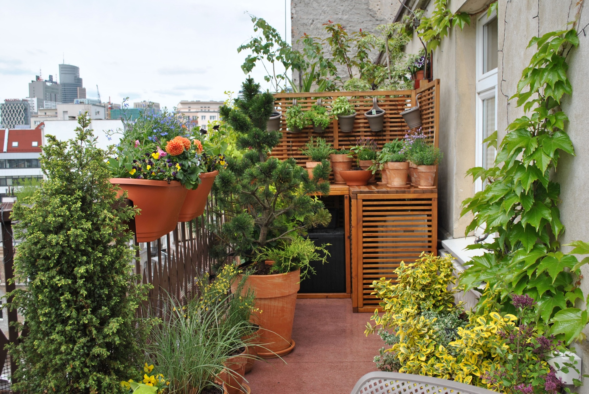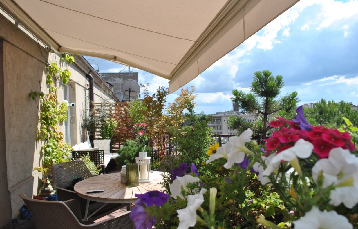 Do urządzania tarasu zostały wykorzystane gliniane, mrozoodporne donice obsadzone niskimi drzewkami, krzewami i bylinami. Rośliny zostały tak dobrane aby balkon zdobił przez cały rok. Rosną tu nie tylko zimozielone krzewy ale także ozdobne z pedów: derenie i klony palmowe. W skrzynkach wiszących na balustradzie kwitną sezonowe kwiaty.