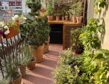 Balkon zaostał umownie podzielony na trzy: kącik wypoczynkowy z kawowym zestawem mebli, część środkową - z okragłym stołem obiadowym i 4 krzesłami oraz część ziołowo - warzywną. Tu klimatyzator został zabudowany drewnem i w połączeniu z panelami zostało wydzielone miejsce 'robocze' z donicami. Uprawiane są zioła i warzywa - ostre odmiany papryczek, pomidory.