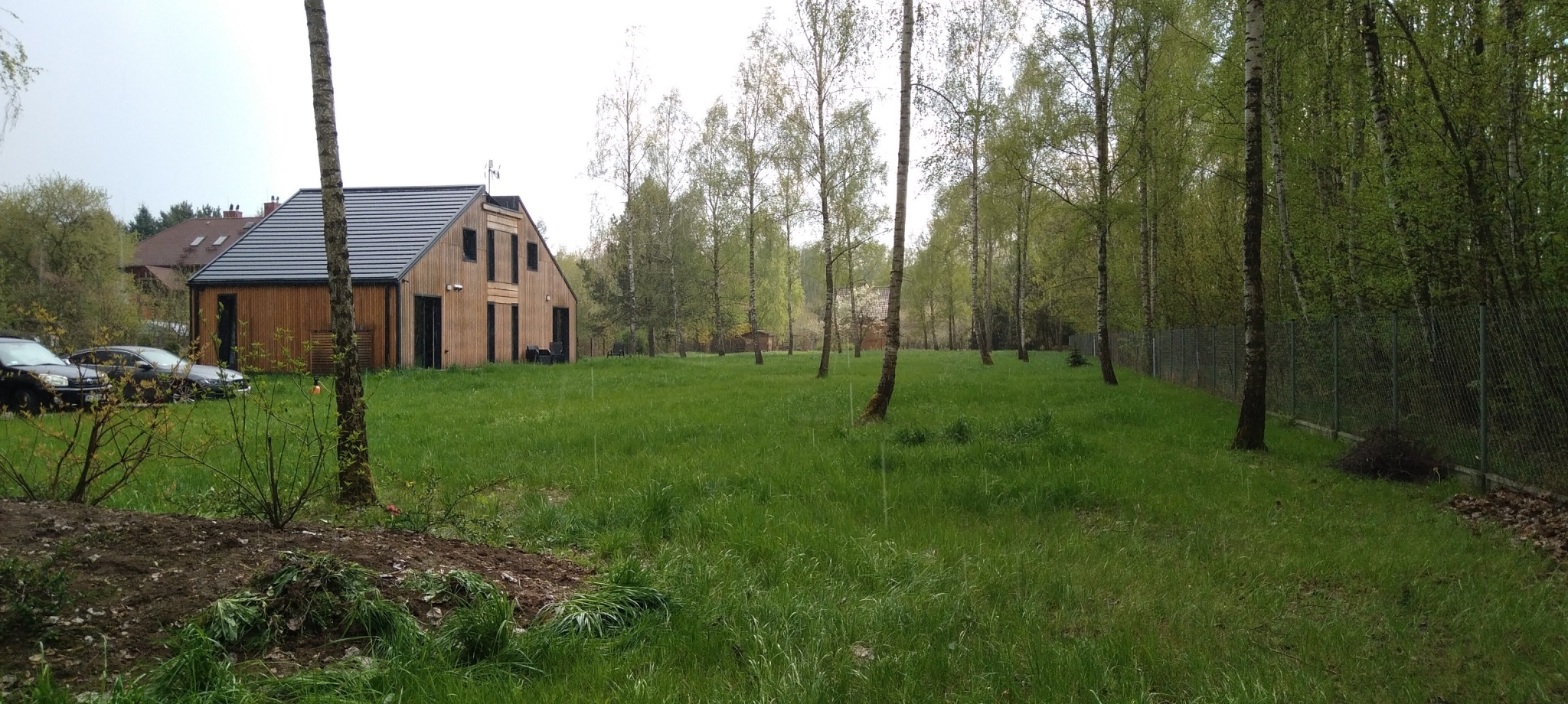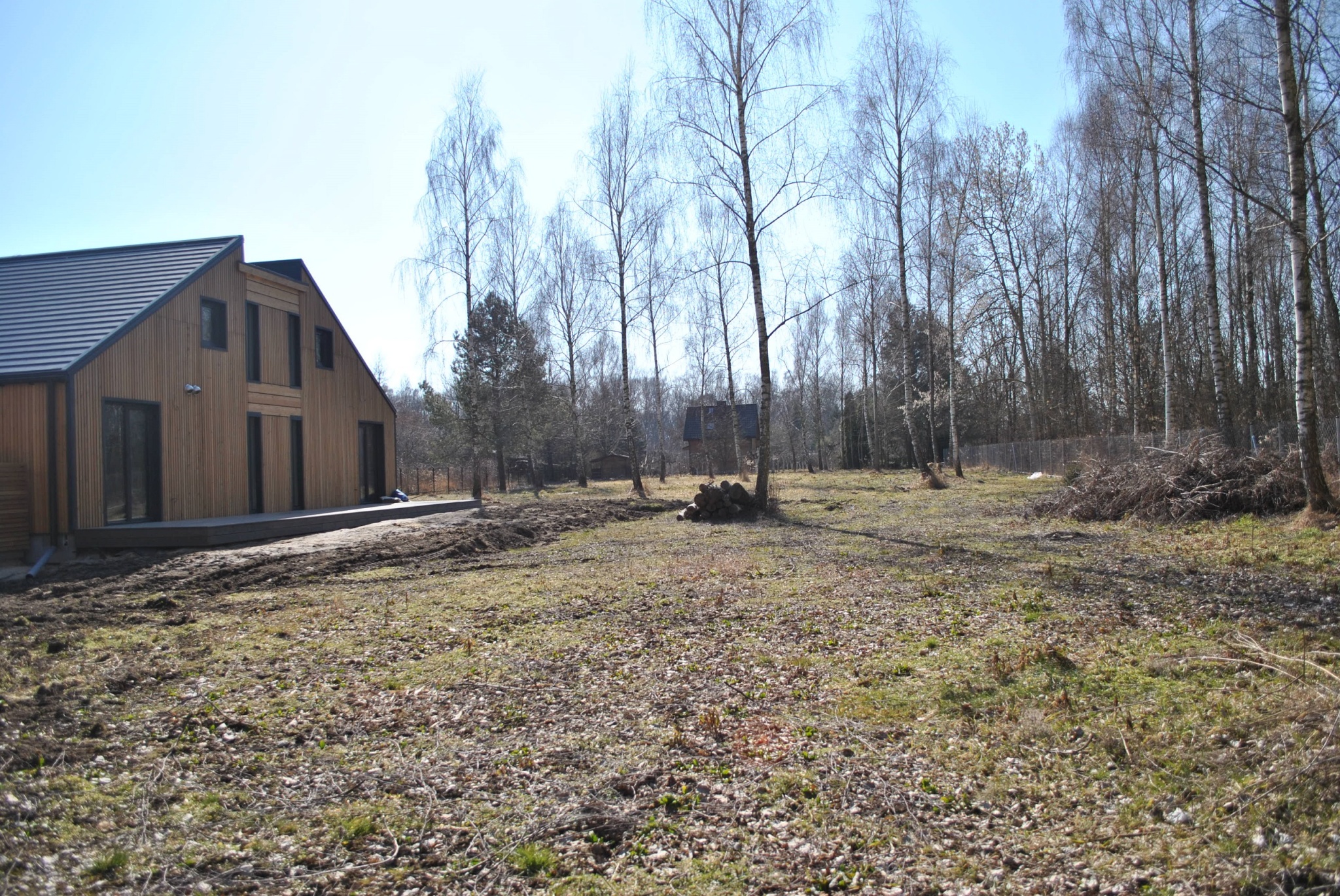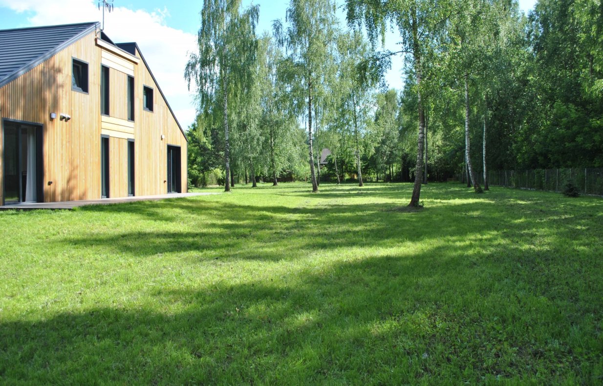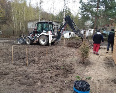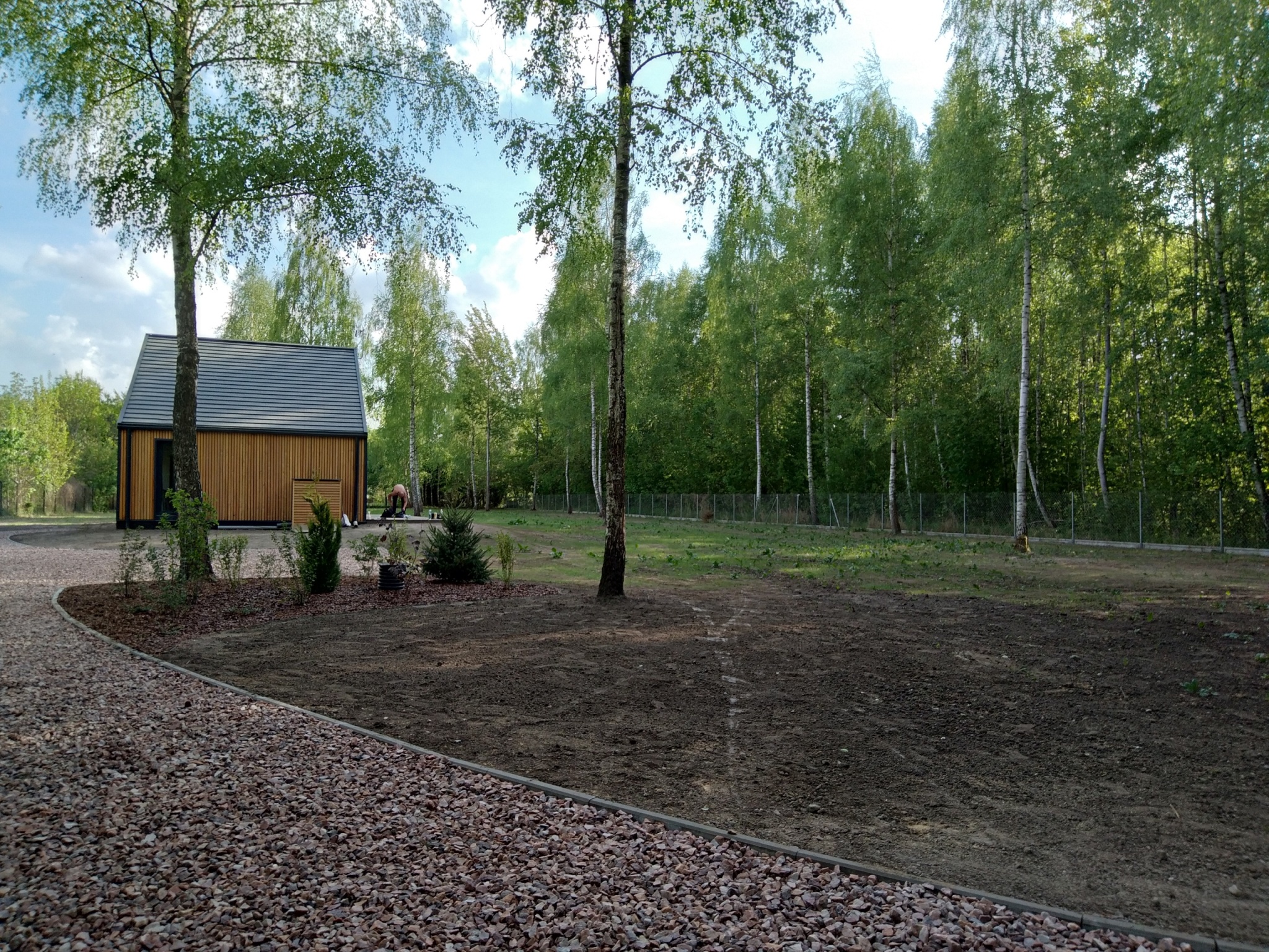 Powierzchnia została gruntownie uprzatnięta, drzewa przycięte. Trawnik z siewu ze specjalną mieszkaną nasion świetnie sprawdza się bez instalacji nawadniania automatycznego. Został wykonany wygodny podjazd z tłucznia.