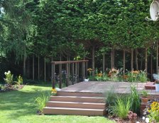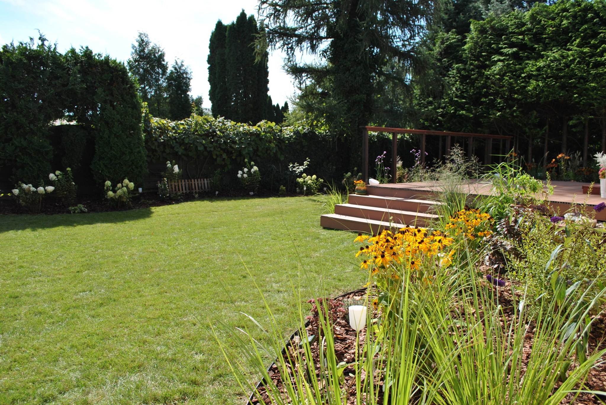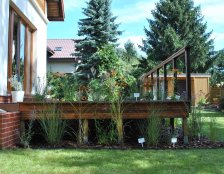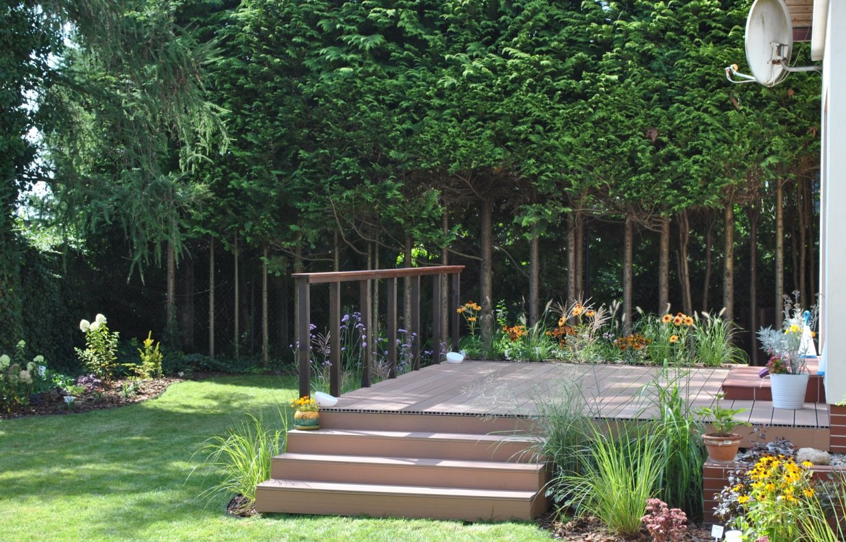Głównym miejscem do wypoczynku jest przestronny taras ułożony z desek kompozytowych. Jest tam miejsce także na donicę w której, bezpośrednio na tarasie, rosną trawy ozdobne i byliny. Kompozycja ogrodu jest uporządkowana i przejrzysta a wybrane rośliny nie wymagaja dużego nakładu pracy pielęgnacyjnej.