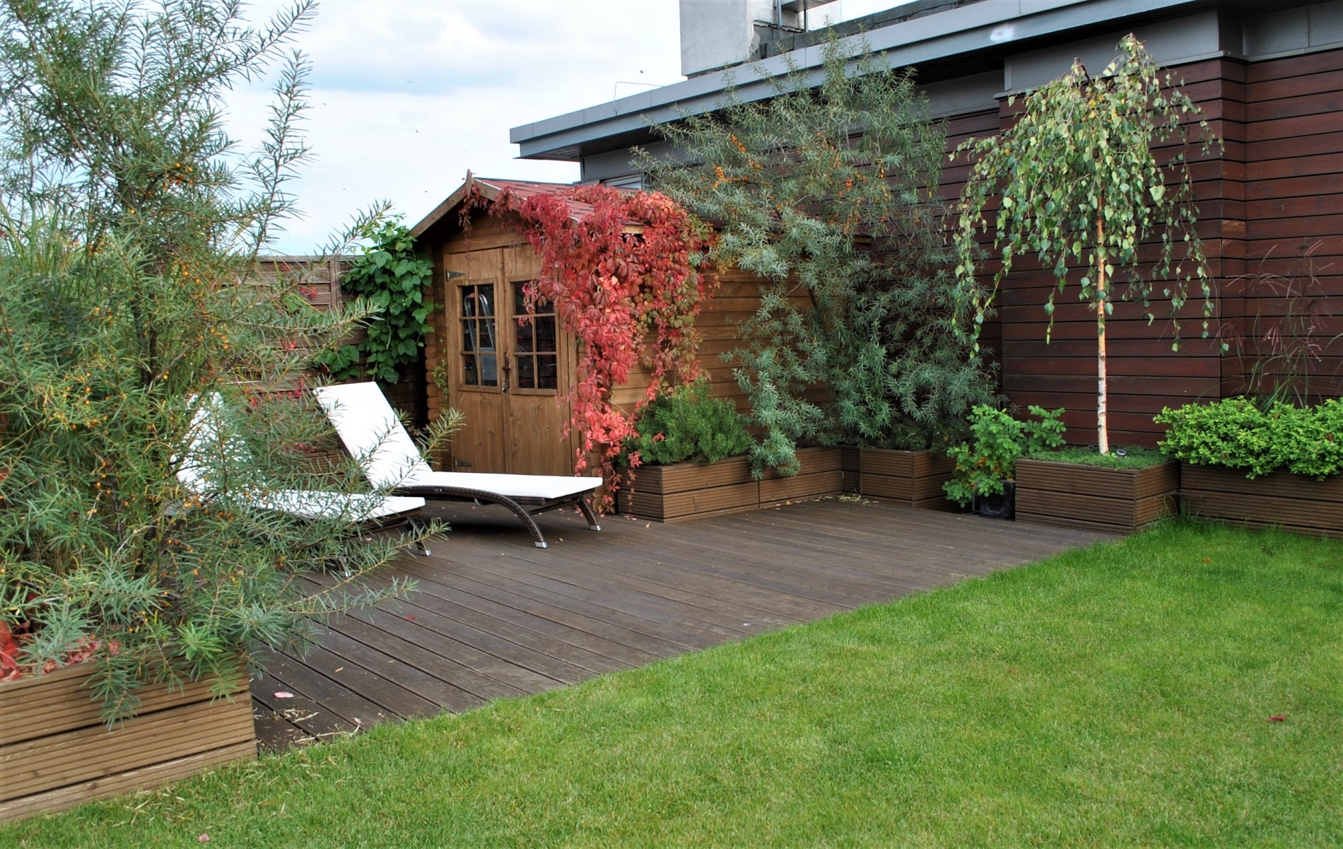 Duża powierzchnia tarasu sprawiła, że z powodzeniem zmieściła się tu przestronna weranda, trawnik, drewniane przejścia, zróżnicowane kąciki wypoczynkowe i praktyczny przy dużym terenie - domek narzędziowy. W części silnie nasłonecznionej to taras z leżakami a bliżej domu - miejsce na grila. Taras z trzech stron jest otulony roślinnością: pnączami, drzewami i krzewami. Wielość werandy, całoroczne zadaszenie i dodatkowe zasłony z materiału żaglowego sprawiają, że znalazły tu miejsce komplety mebli obiadowych i kawowych oraz ogrzewacze elektryczne. To kameralne miejsce całorocznego odpoczynku.