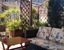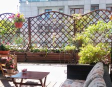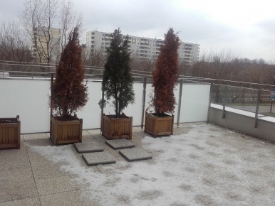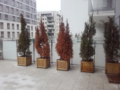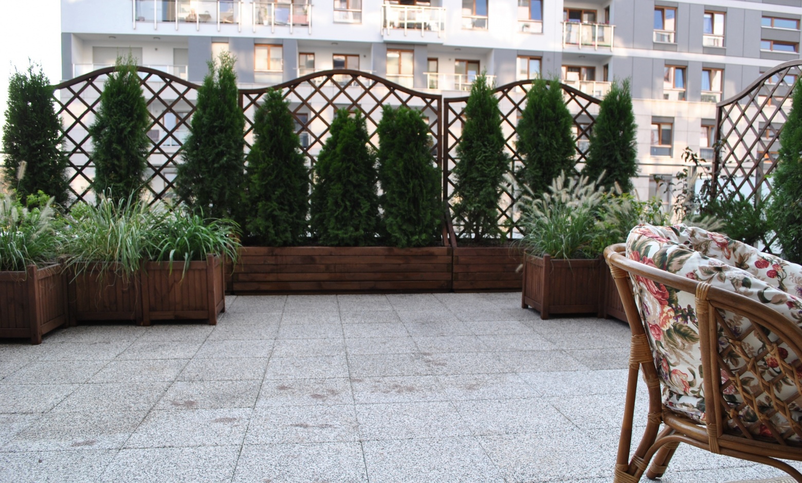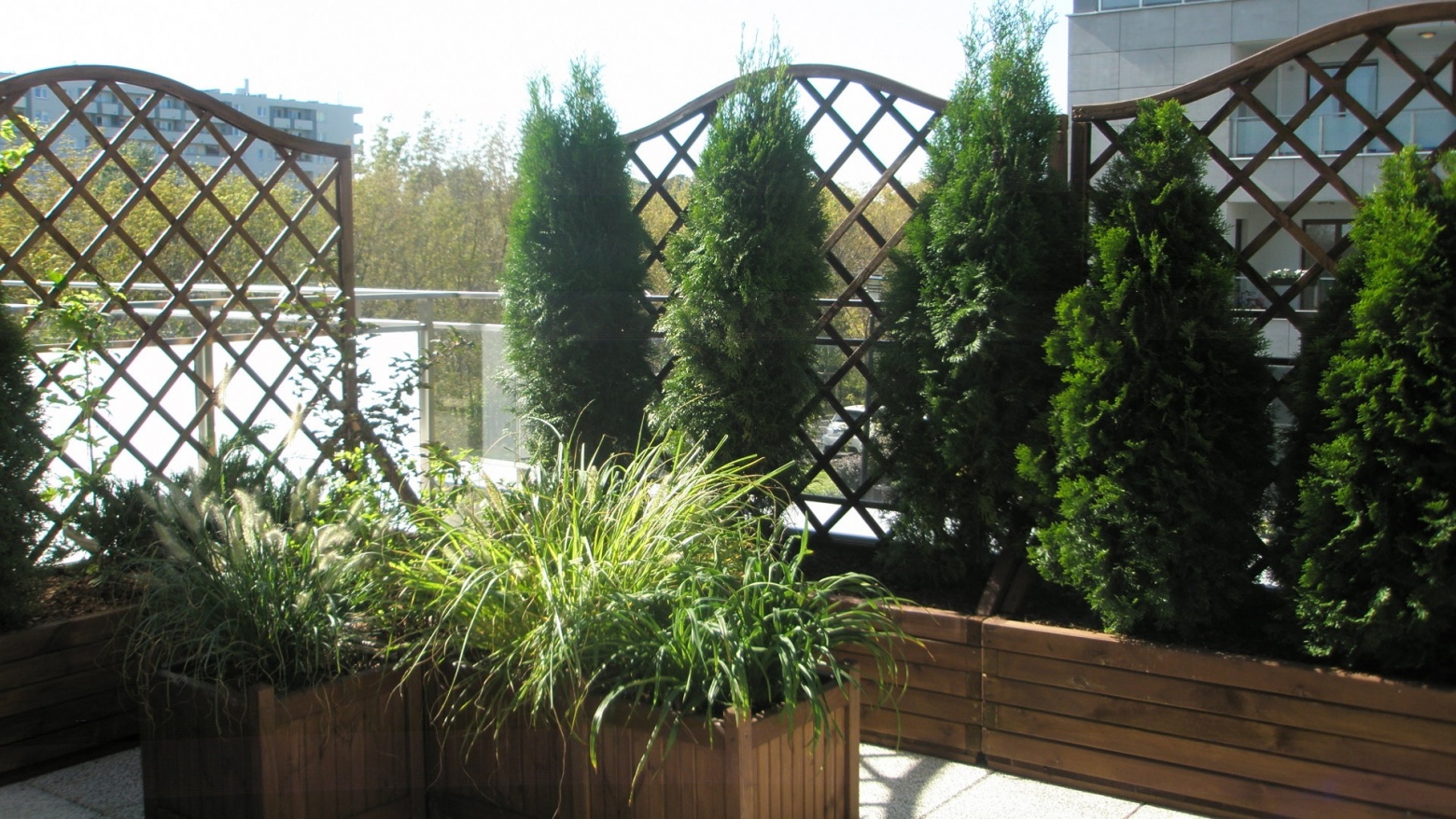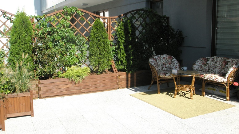 Taras oddzielony został drewnianymi panelami od sąsiednich tarasów. Dodatkowo obszerne skrzynie okalają taras. Krzewy to odporne i dekoracyjne zestawienie.