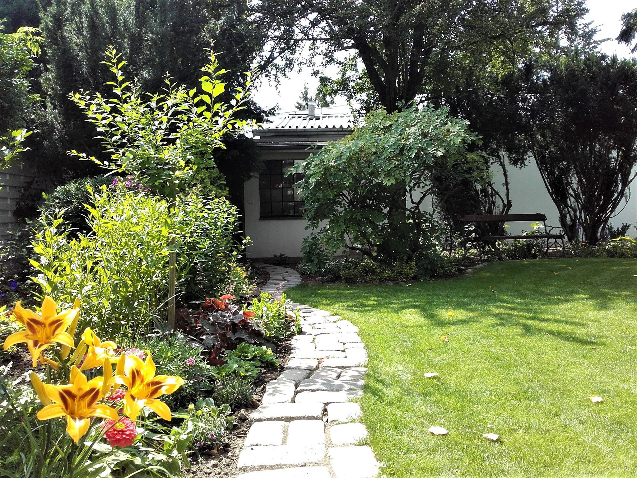 Po realizacji prac, przestrzeń zmieniła się całkowicie. Zostały posadzone byliny, cebule wiosennych i wczesno - letnich kwiatów, kwiaty jednoroczne jako uzupełnienie kompozycji. Zamontowane zostały malowane na biało - drewniane panele oddzielające ogród od sąsiedniej posesji. To piękne tło dla kwitnących róż, hibiskusów, dzielżanów, rudbiekii, lawendy, traw ozdobnych i kocimiętki. Miejsca półcieniste zostały obsadzone funkiami, żurawką, dzwonkami i języczką. Sukcesywnie będą dosadzane malwy oraz kwiaty jednoroczne: begonie, niecierpki.