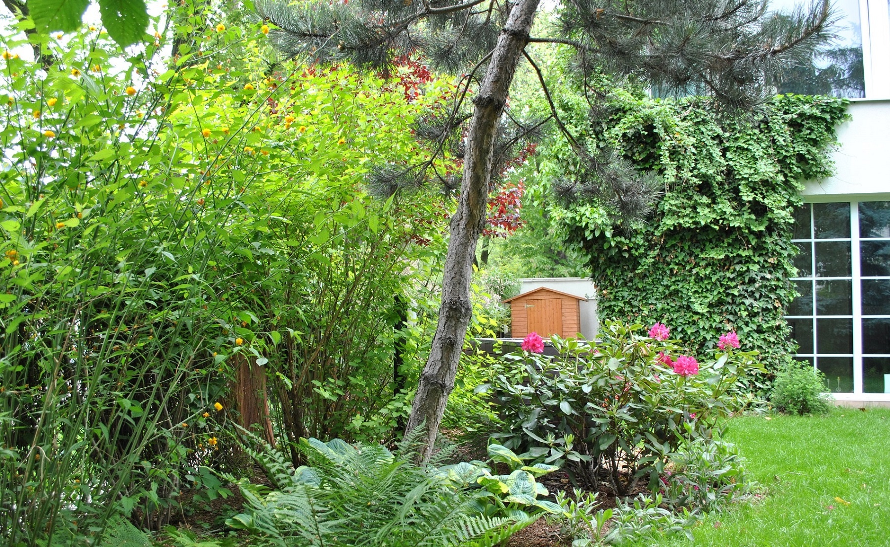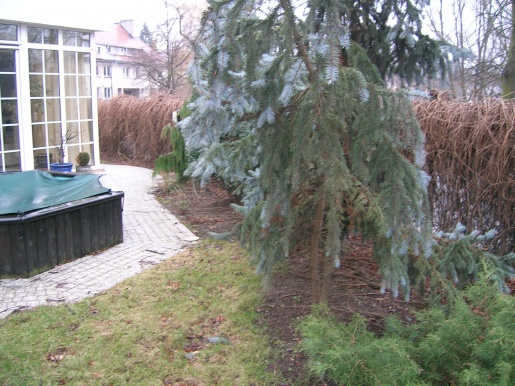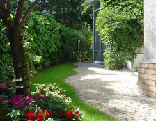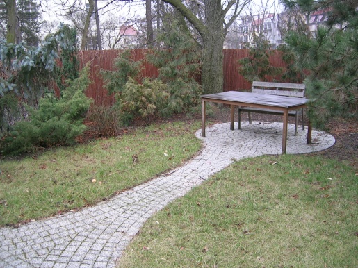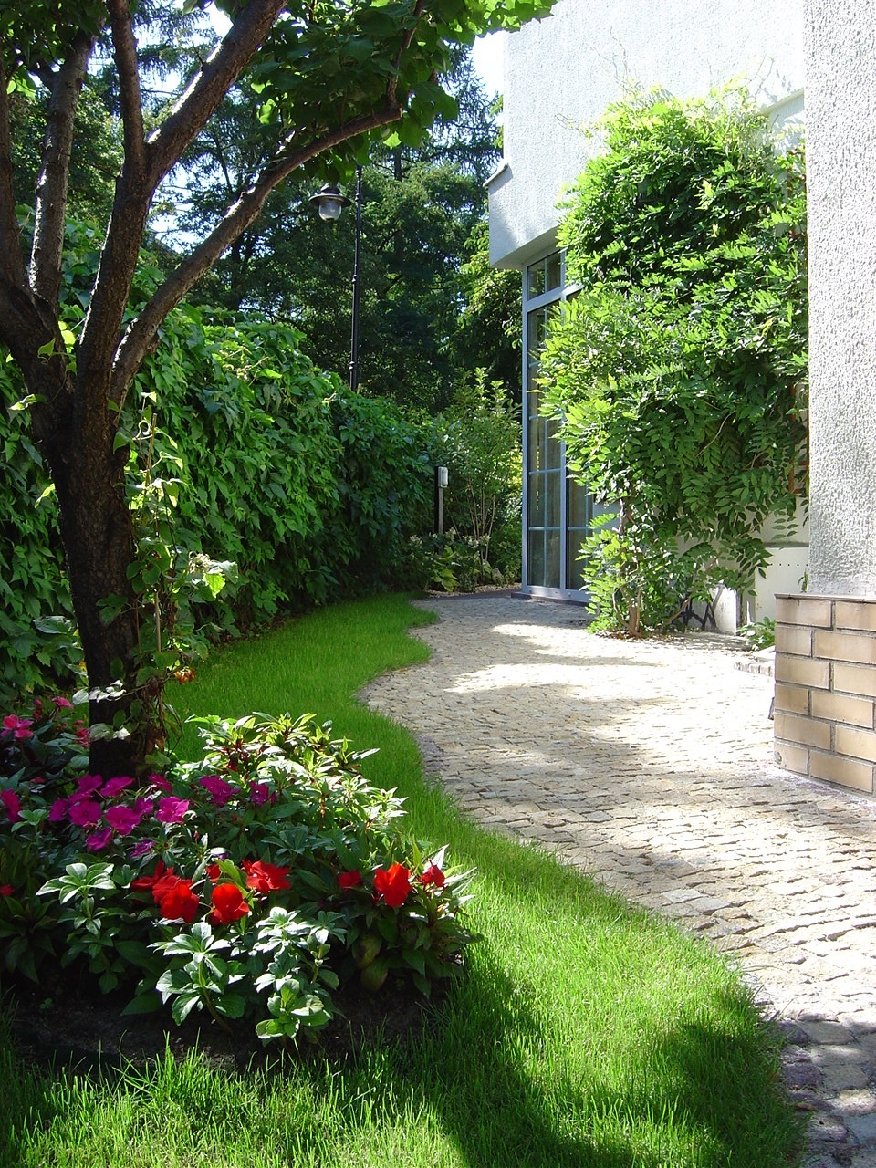 Projekt uwzględnił ukrycie trójkątnego kształtu działki, wprowadzenie naturalnego oddzielenia od ulicy, miejsca do wypoczynku. Powstał ogród pełen kolorowych krzewów i bylin z dużym placem z płyt granitowym. Kwadratowy plac mieści się w najwęższym kącie ogrodu i dzięki ustawieniu tam altany i kompletu mebli wypoczynkowych - maskuje kształt ogrodu. Rabaty oraz taras drewniany zostały poprowadzone równolegle do budynku, wydłużając perspektywę patrzenia. Boki posesji są obsadzone warstwowo roślinnością. Takie zabiegi powiększają optycznie ogród i tuszują niedoskonałości.