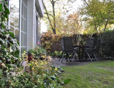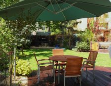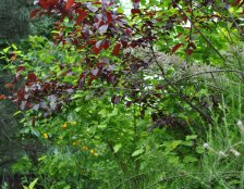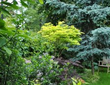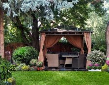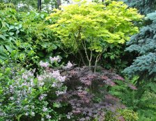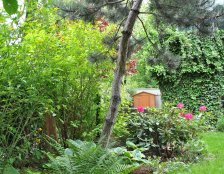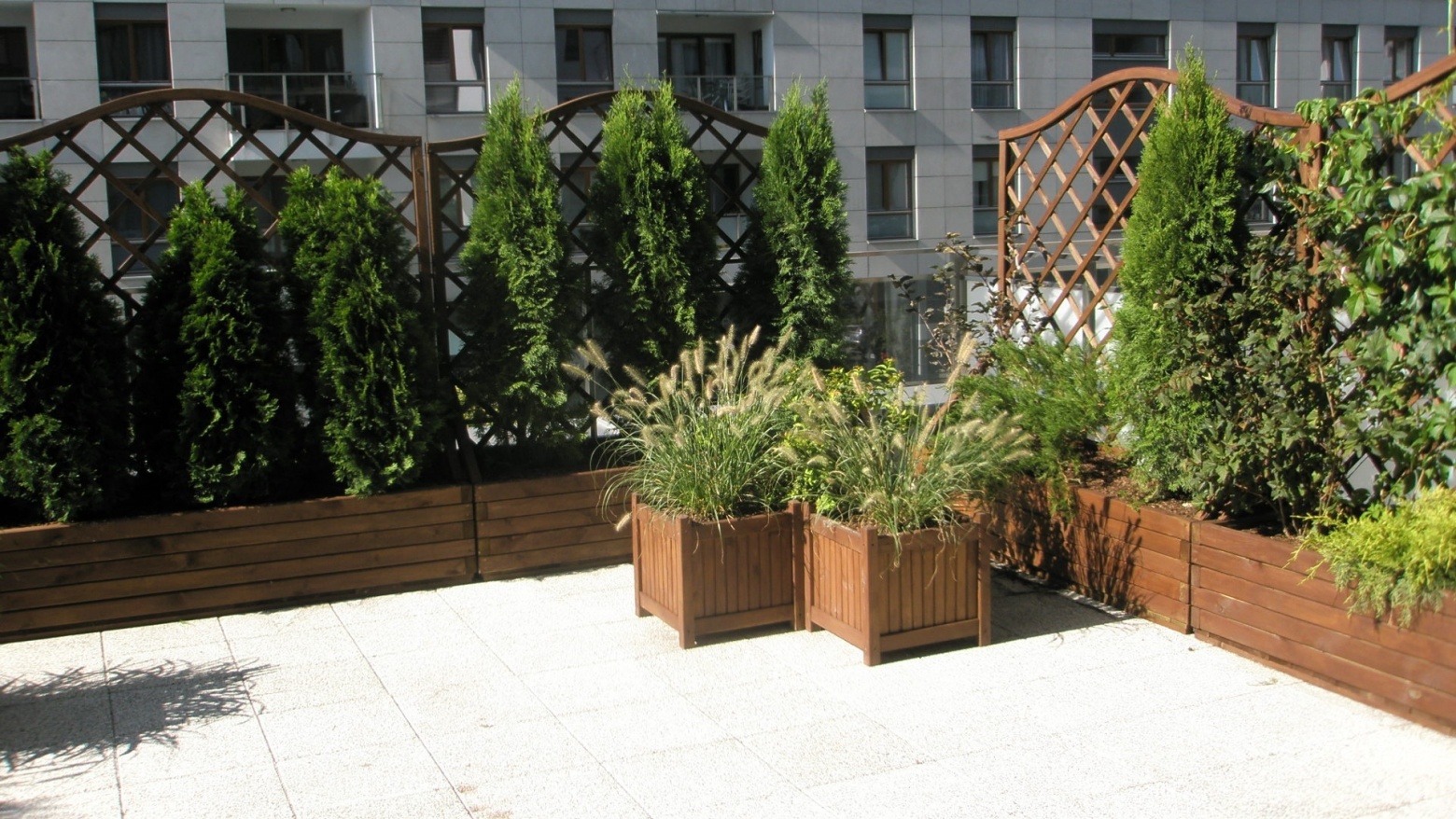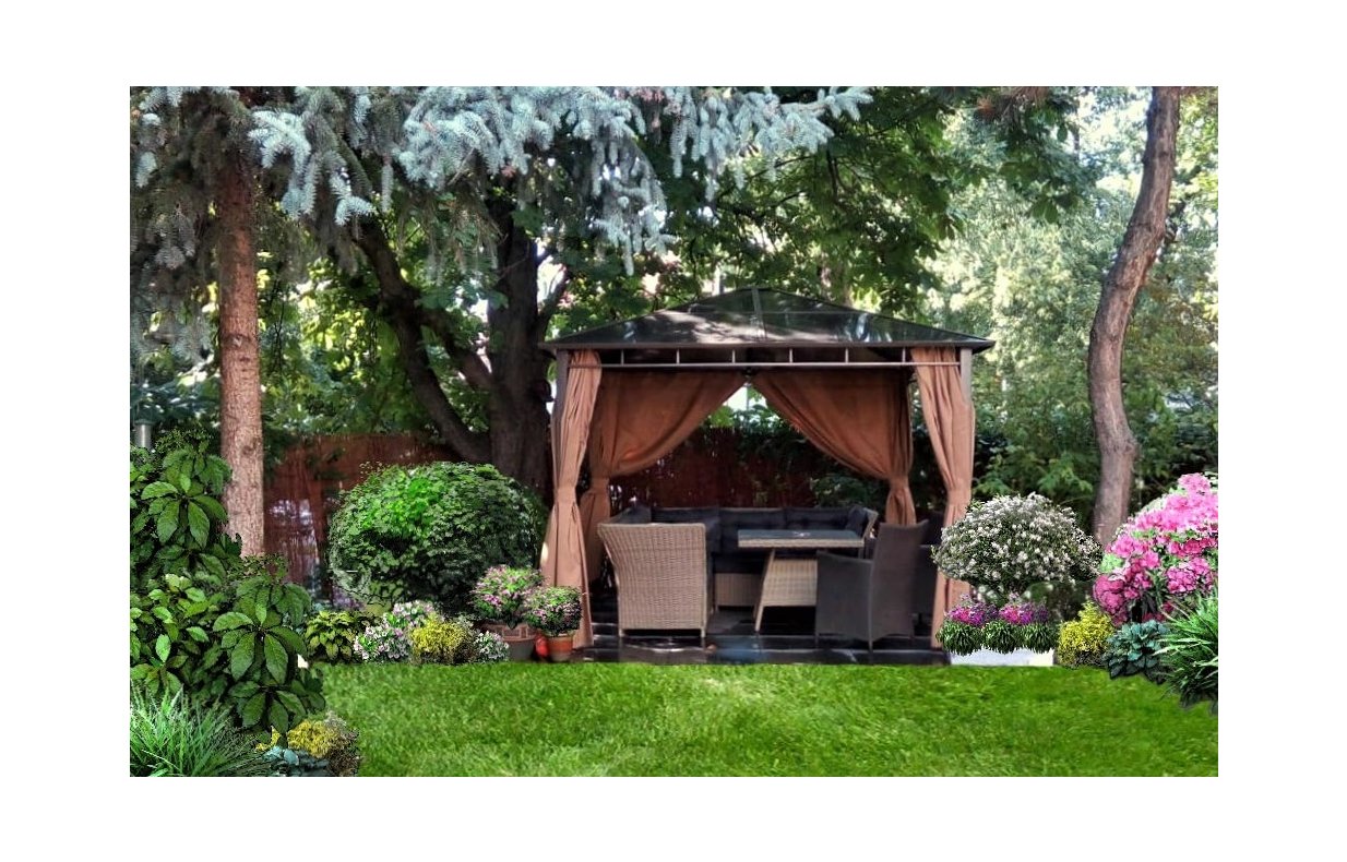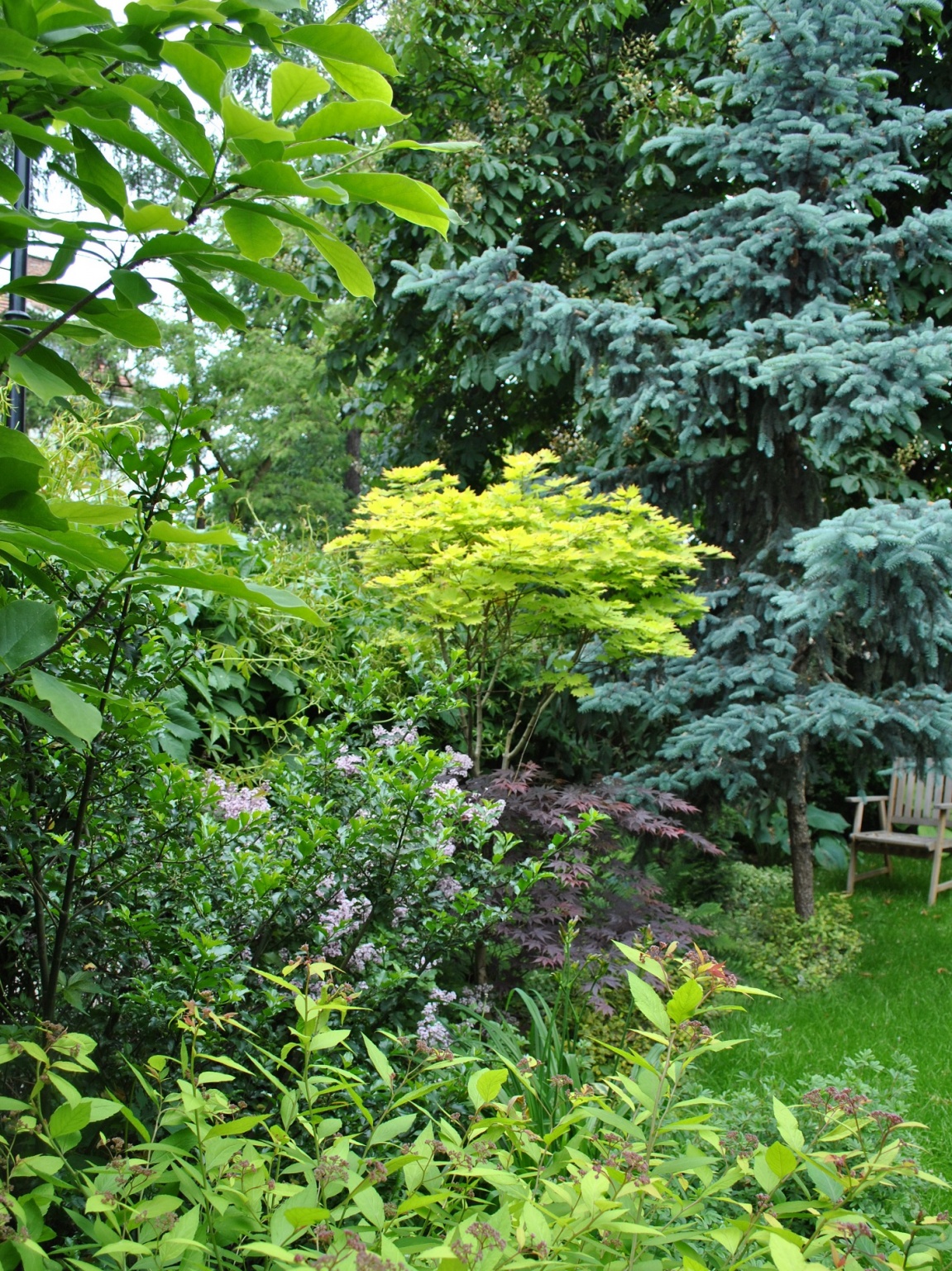 Projekt uwzględnił ukrycie trójkątnego kształtu działki, wprowadzenie naturalnego oddzielenia od ulicy, miejsca do wypoczynku. Powstał ogród pełen kolorowych krzewów i bylin z dużym placem z płyt granitowym. Kwadratowy plac mieści się w najwęższym kącie ogrodu i dzięki ustawieniu tam altany i kompletu mebli wypoczynkowych - maskuje kształt ogrodu. Rabaty oraz taras drewniany zostały poprowadzone równolegle do budynku, wydłużając perspektywę patrzenia. Boki posesji są obsadzone warstwowo roślinnością. Takie zabiegi powiększają optycznie ogród i tuszują niedoskonałości.