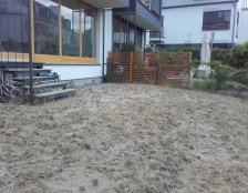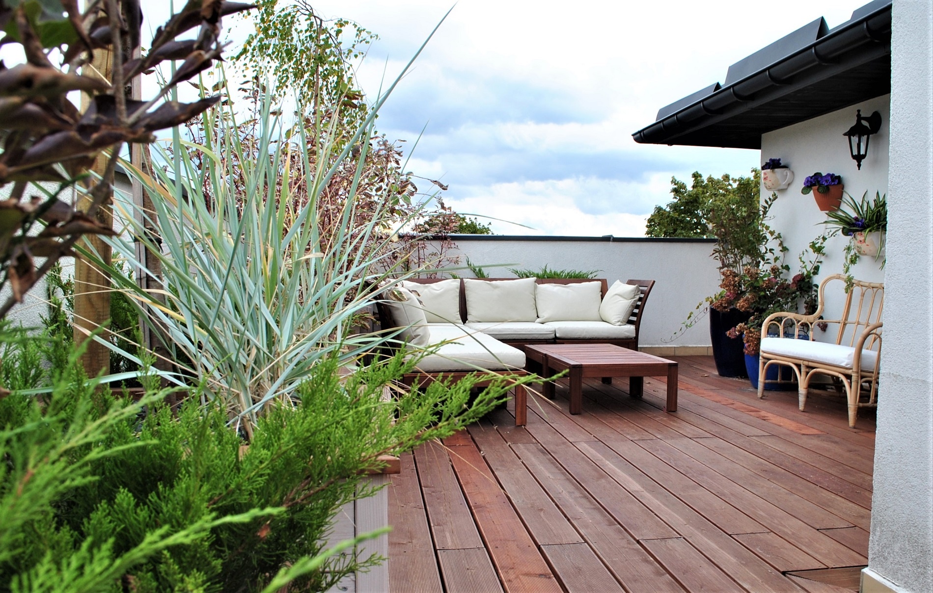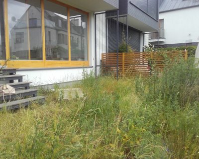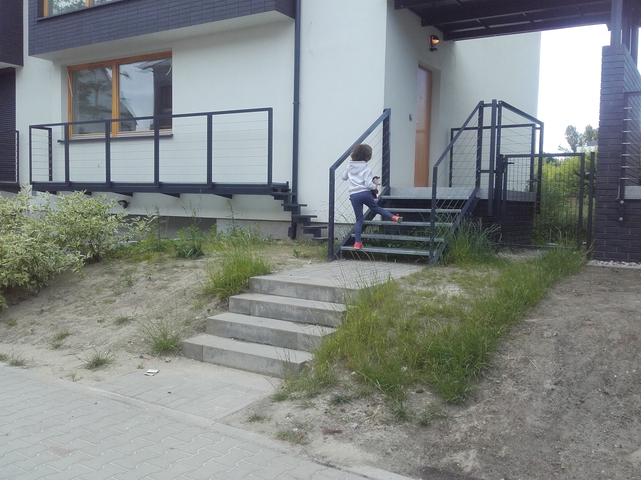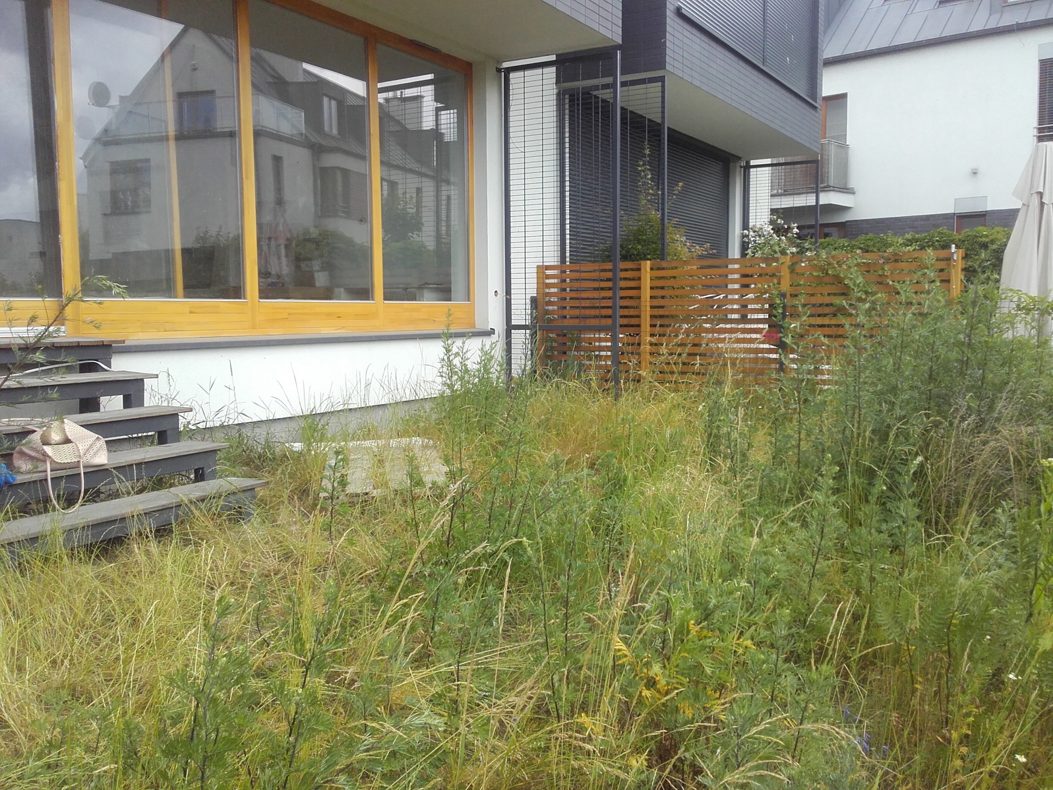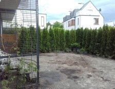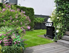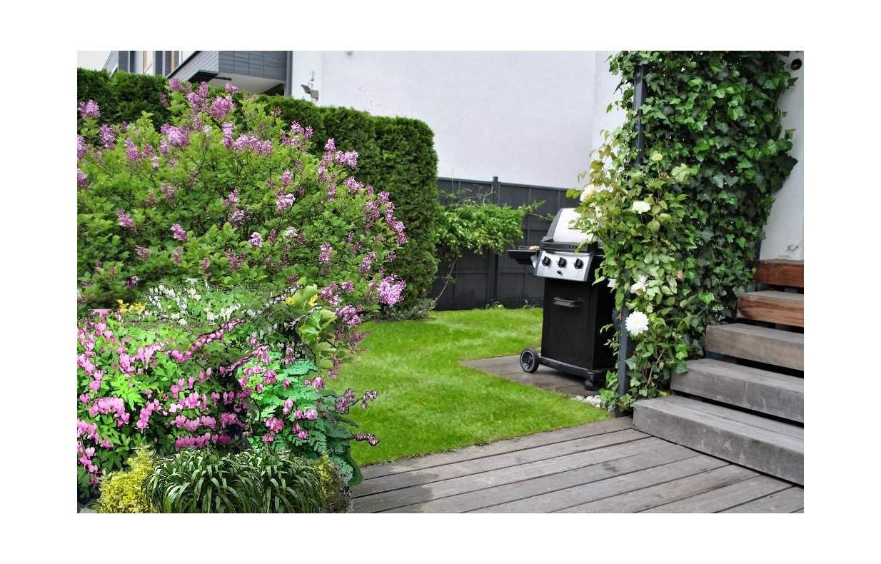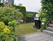 Ogród o powierzchni 200m2 został zaprojektowany tak, aby każdy z mieszkańców znalazł dla siebie miejsce. Jest kącik grillowy, miejsce na rozkładany sezonowo basen i duży, drewniany taras wokół którego latem toczy się życie.