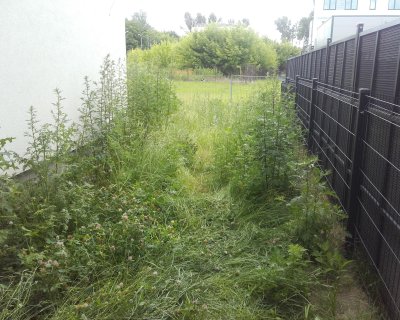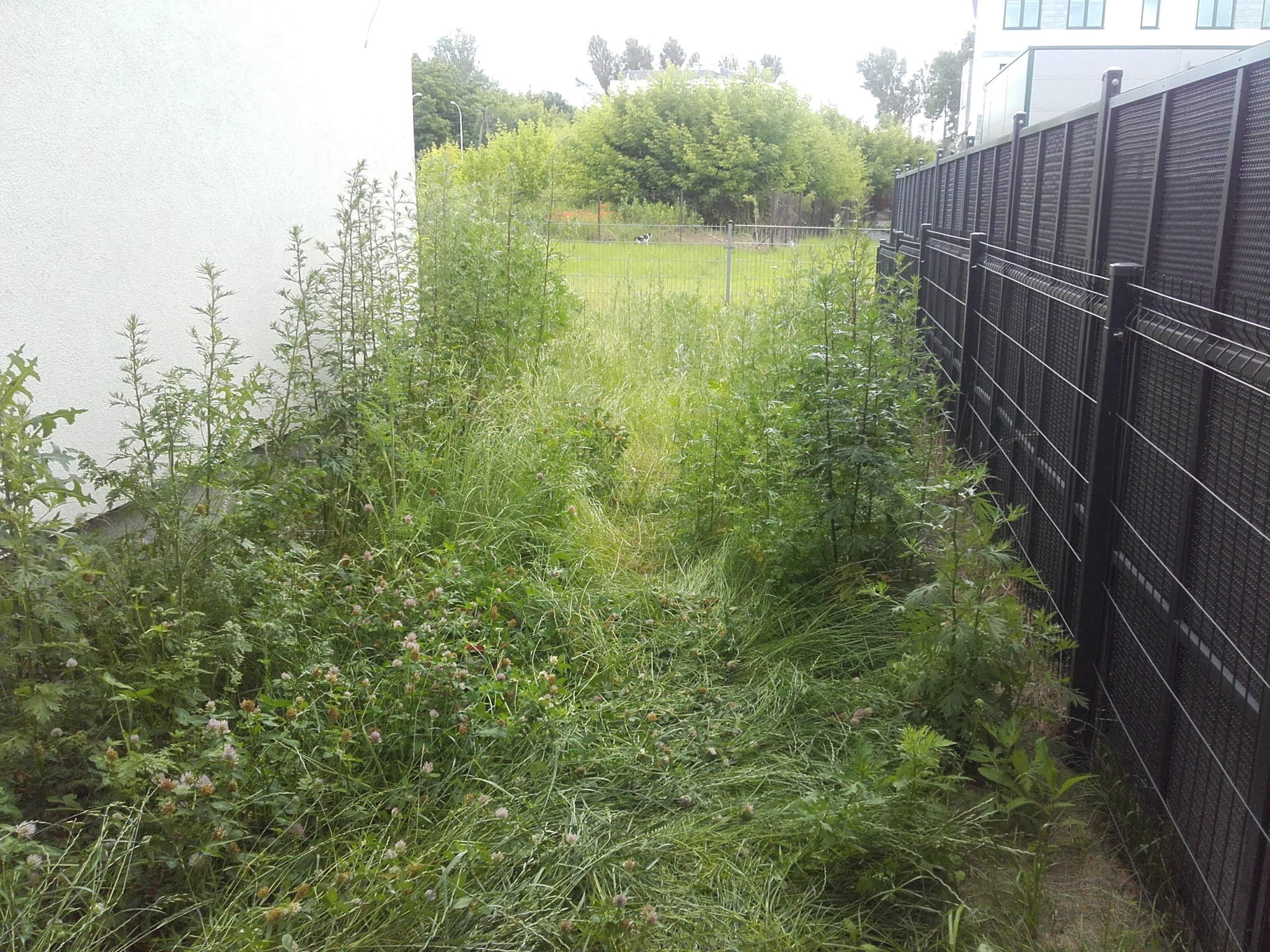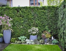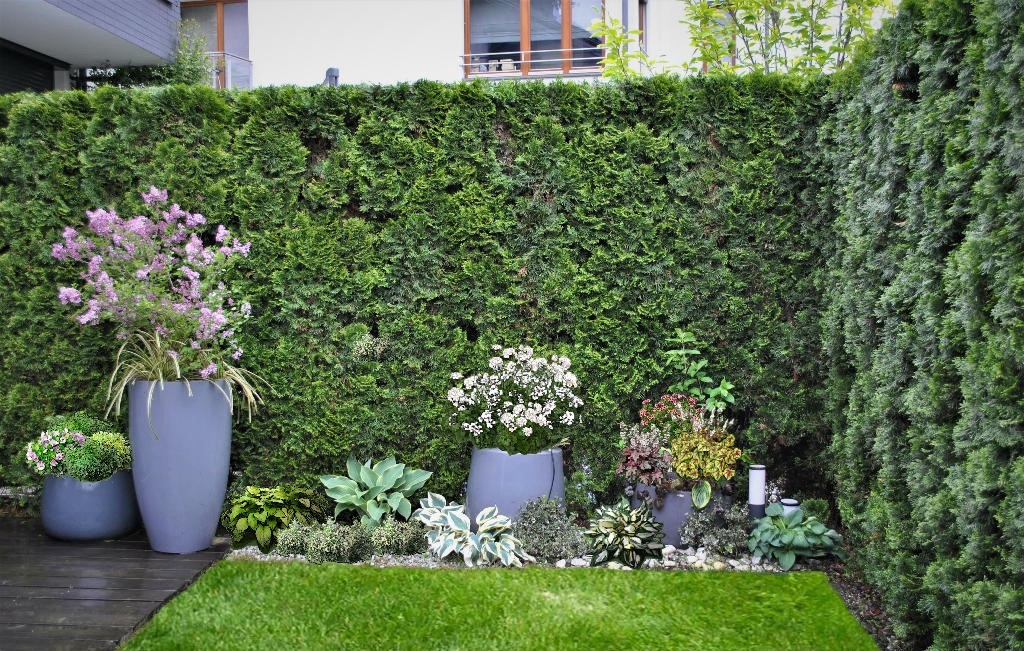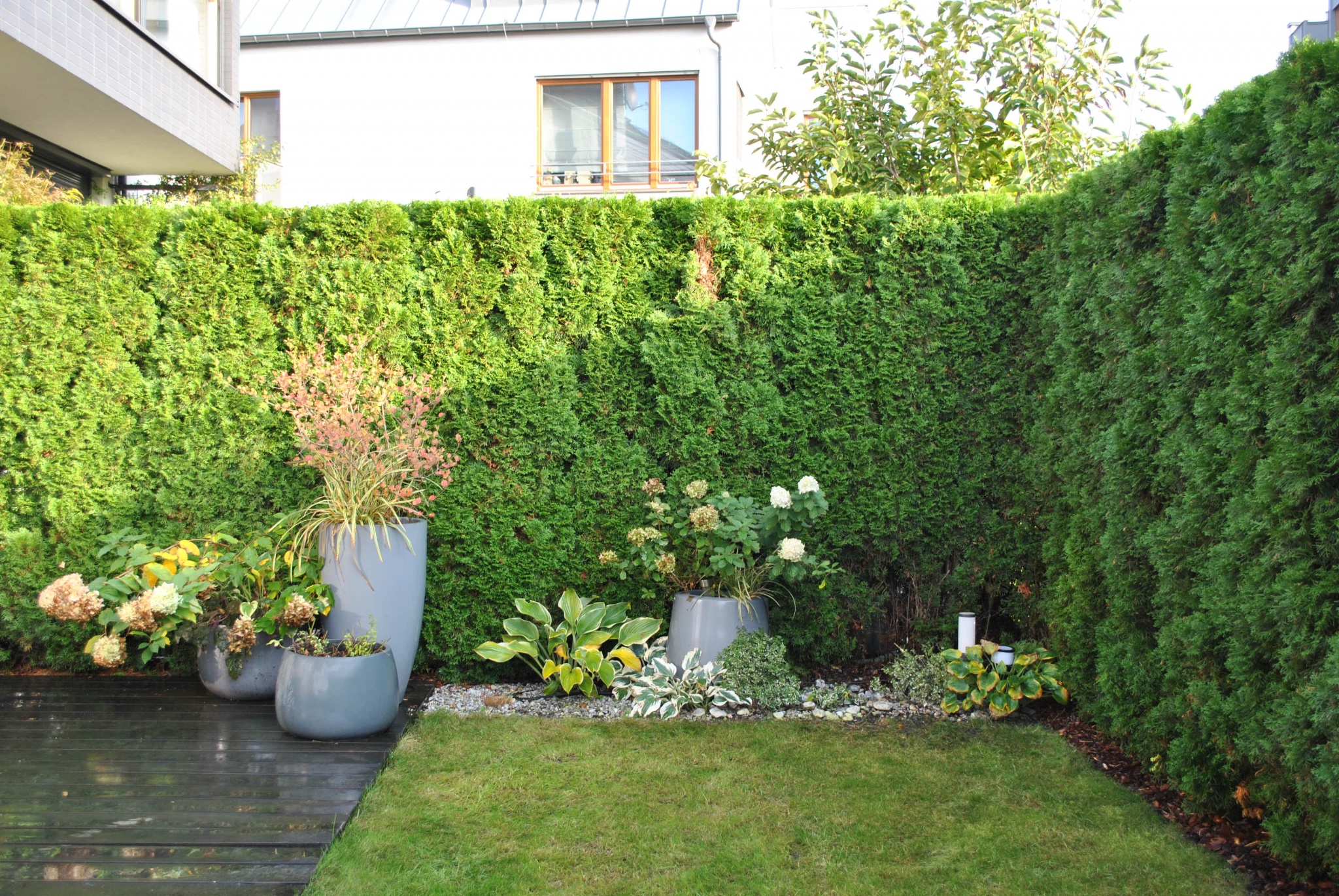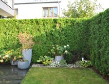 Proste, jednorodne nasadzenia podkreślają granicę działki. Zimozielony żywopłot skutecznie oddziela mieszkańców od sąsiadów i gwarnych ulic.