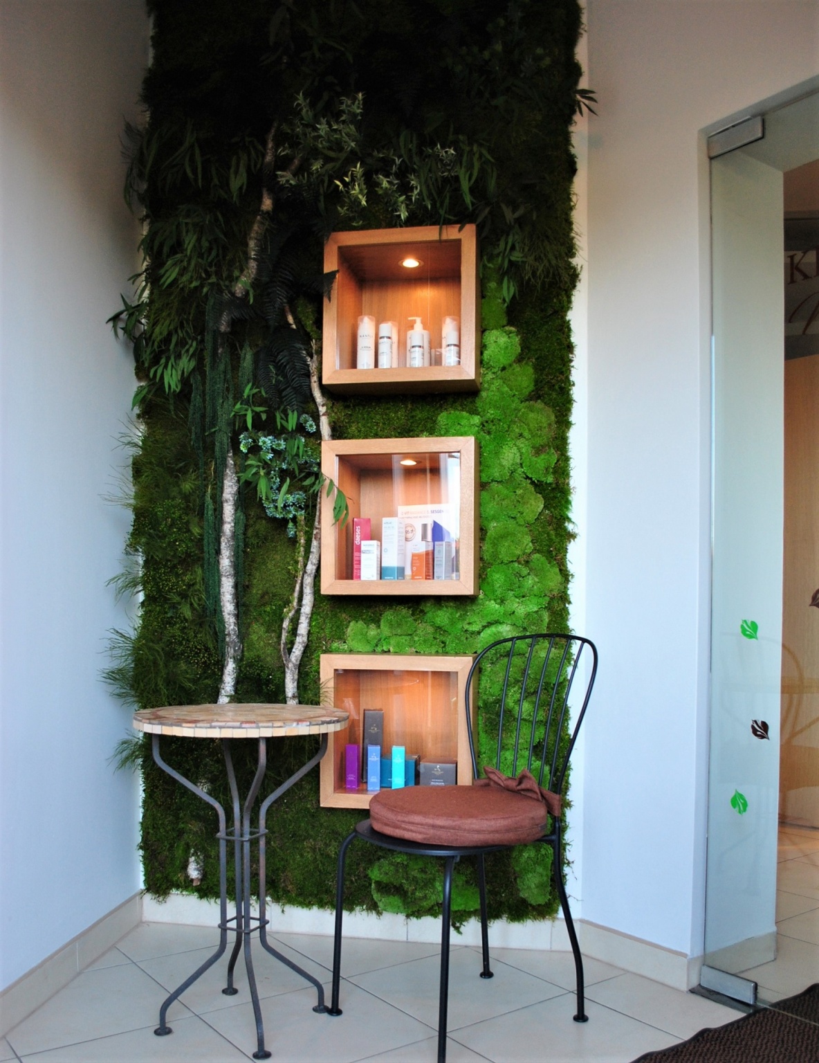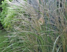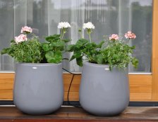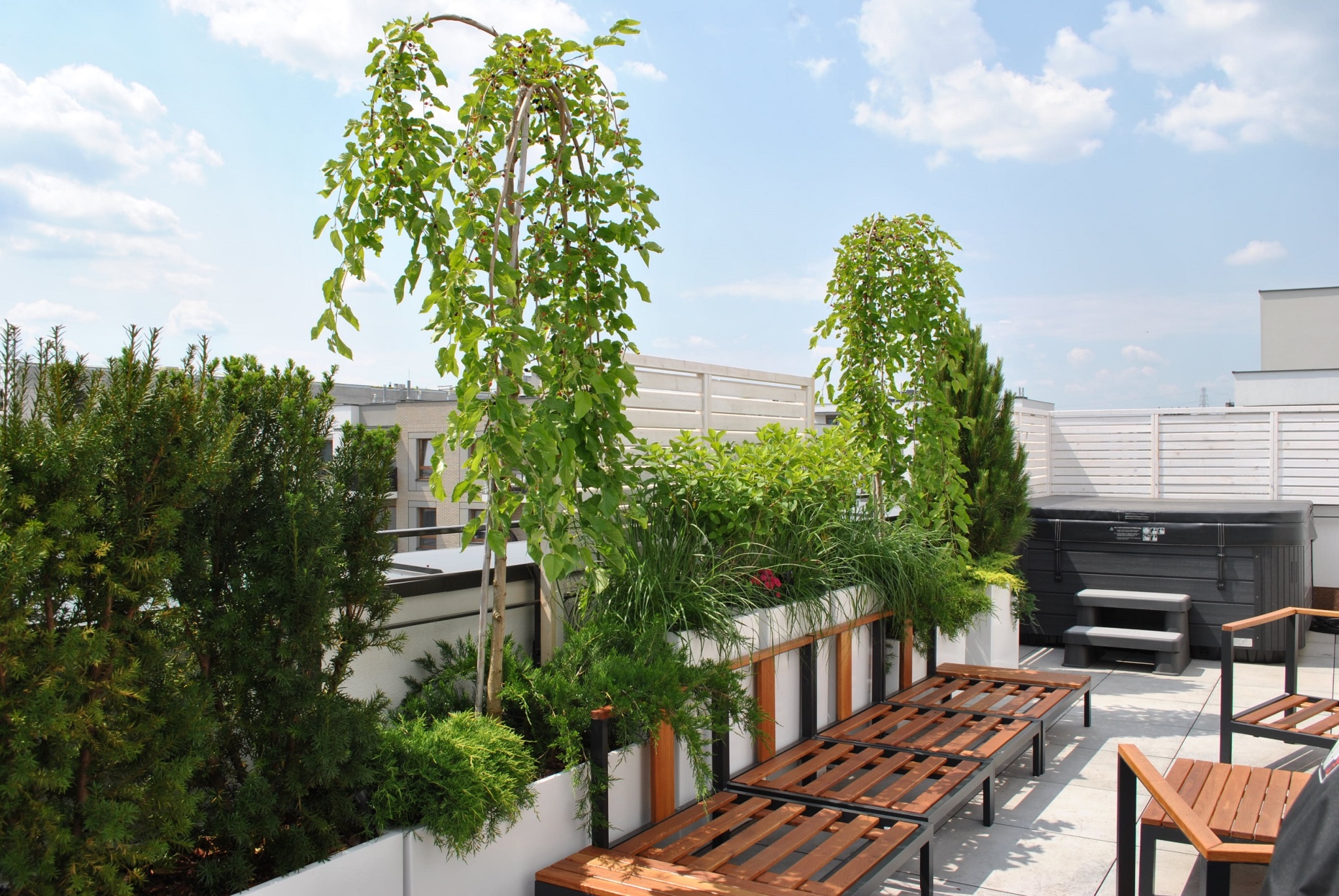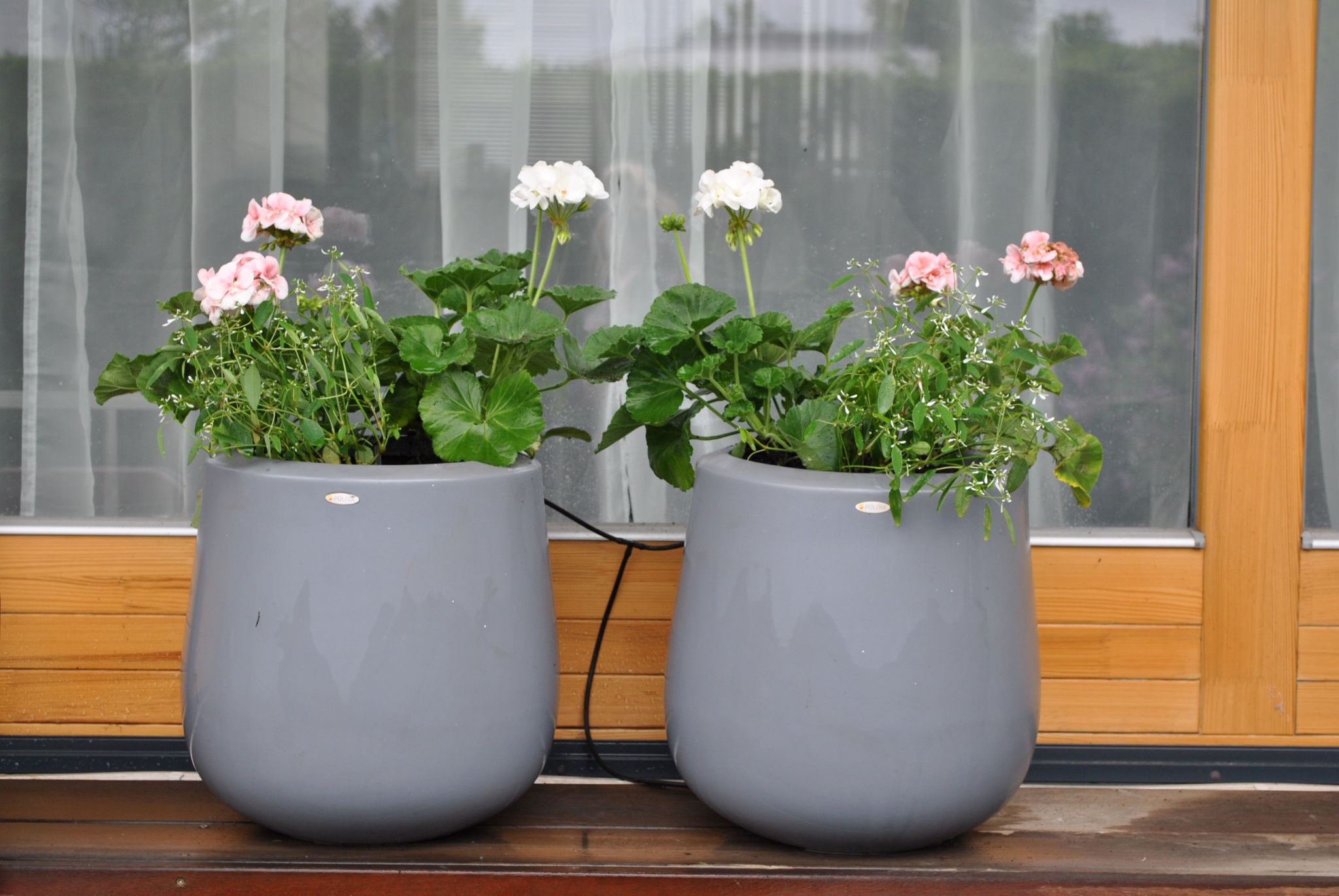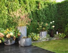 Dekoracyjnym akcentem są duże szare donice z tworzywa obsadzone kwitnącymi krzewami, trawami i kwiatami sezonowymi.