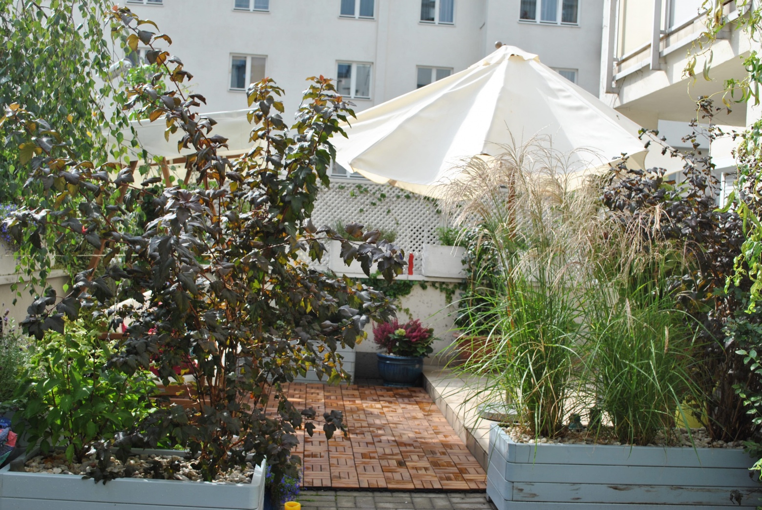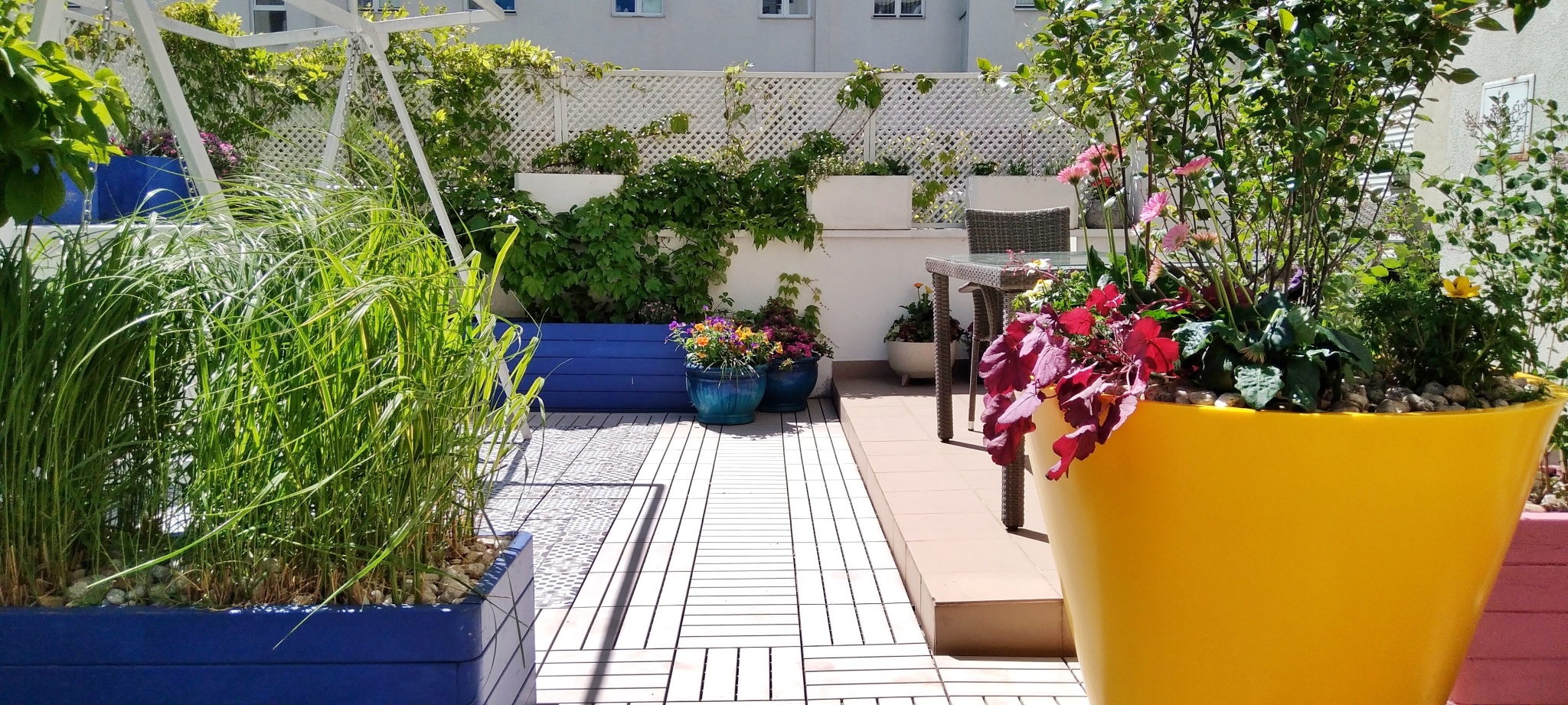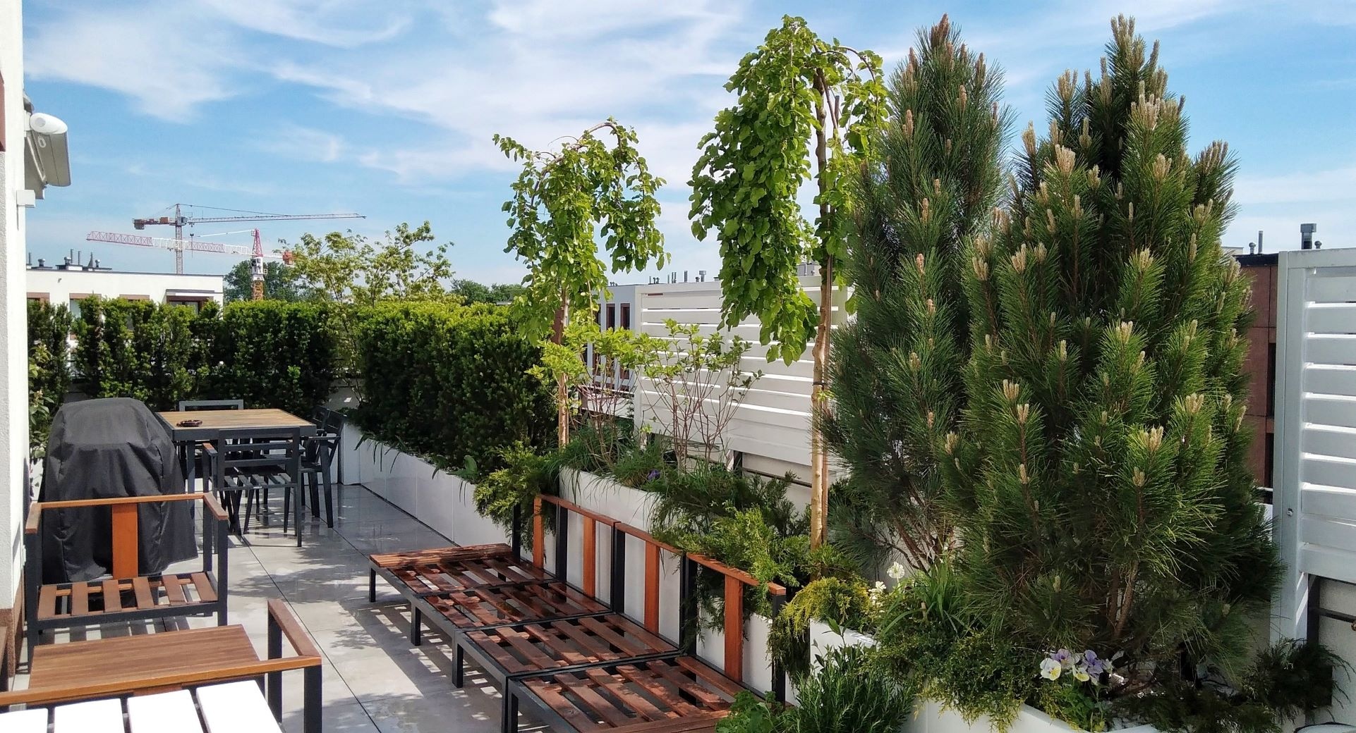 Taras jest usytuwany na dachu garażu podziemnego, na środku osiedla. Właścicielom zależało na stworzeniu intymnego miejsca i oddzieleniu się od sąsiednich budynków w maksymalny sposób. Roślinność, jako uzupełnienie, została dopasowana do odważnie malowanych skrzyń. Dużym walorem tarasu są: pionowe zielone ściany z pnączy, dobrze rosnące drzewa i krzewy, kącik z ziołami. Tu miejsce znalazł domek ogrodnika, sezonowo rozkładany basen dla dzieci, kącik warzywny. Od górnych pięter, mieszkańców tarasu odgradzają duże parasole przeciwsłoneczne.