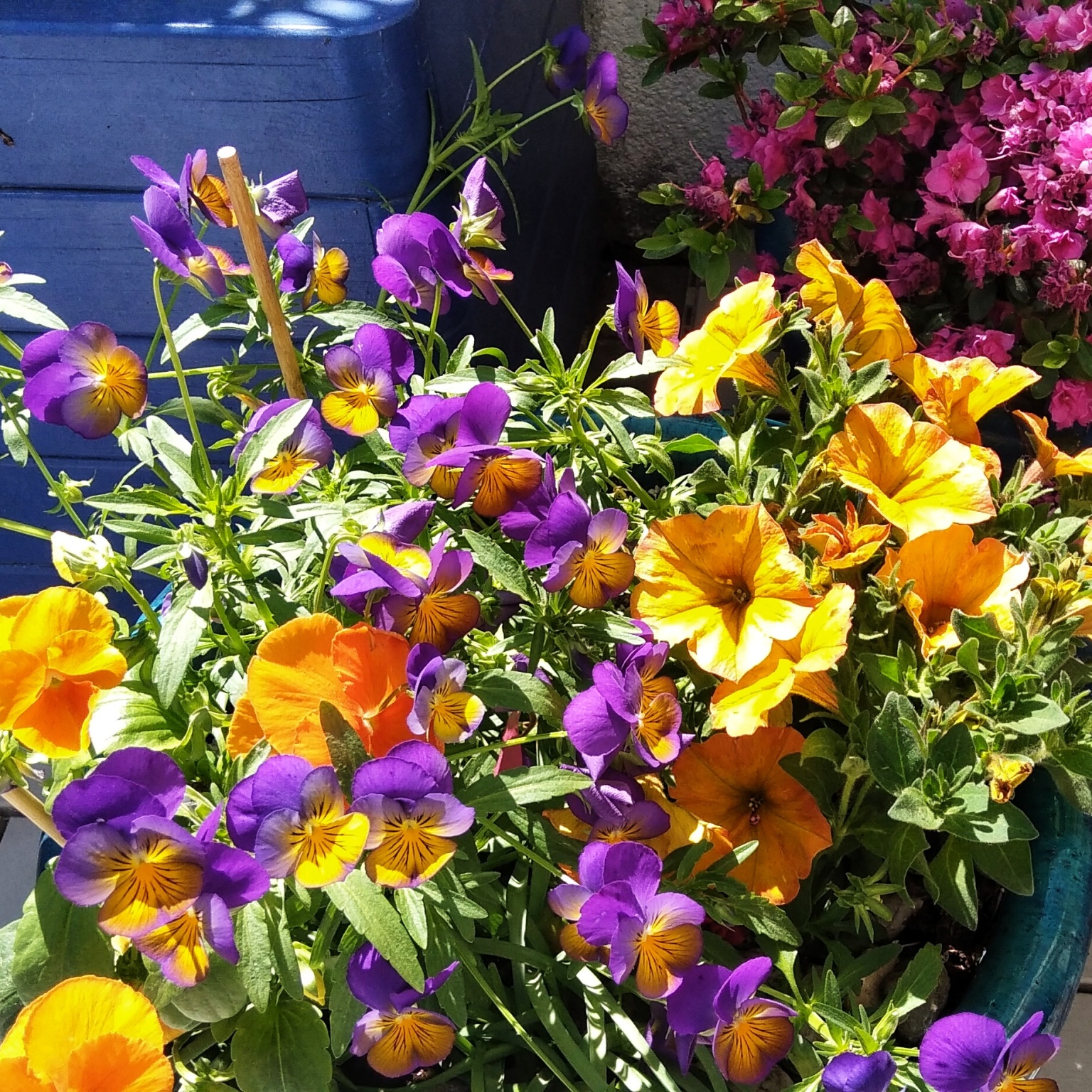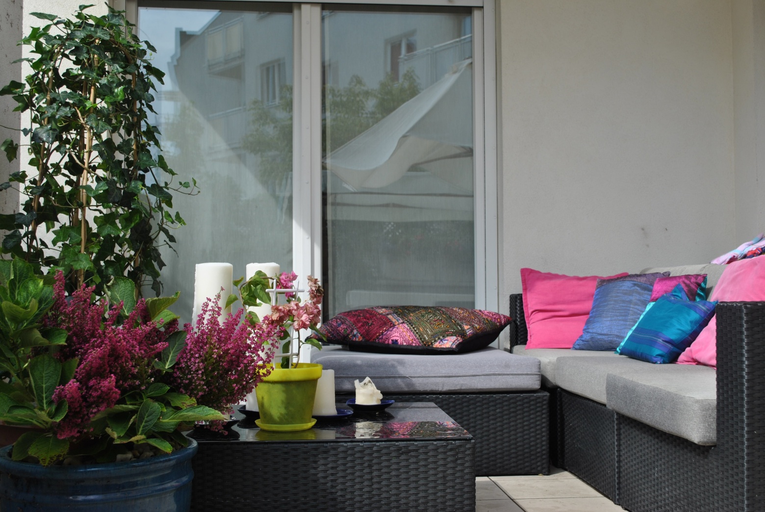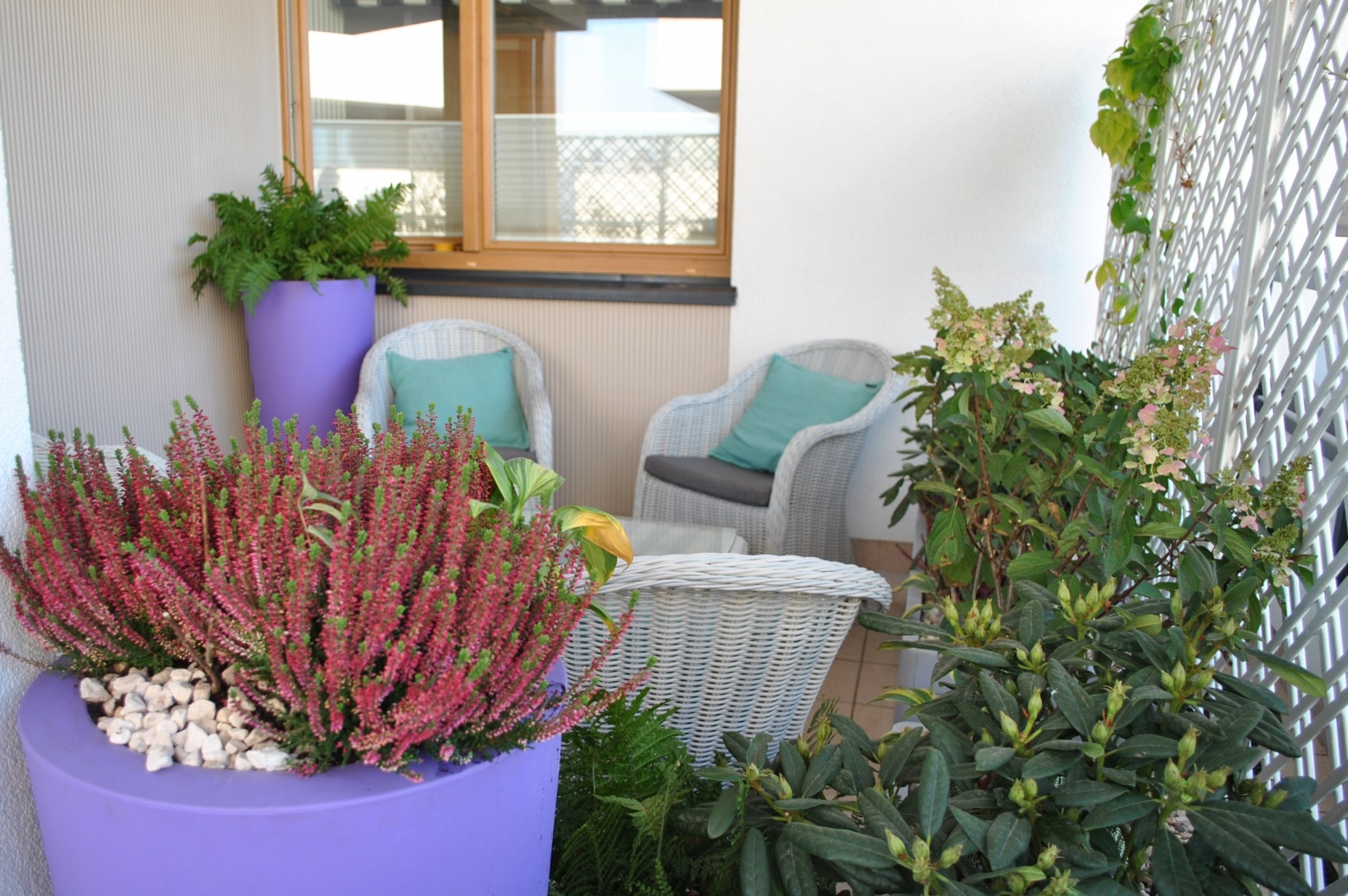 Na tym tarasie króluje kolor. Odcienie fioletów, różów, amarantów tworzą ciekawą kompozycję.
