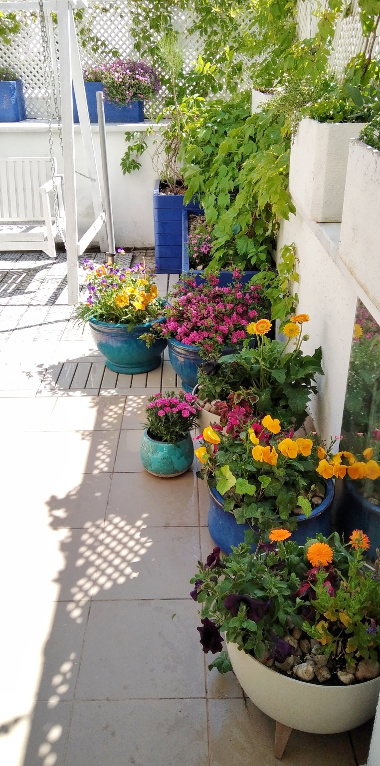 Zastosowane kolory podkreśliły i ożywiły przestrzeń i monotonne ściany otaczające taras. Kolorowe poduchy rozłożone na huśtawce i zestawie mebli pięknie eksponują pomysł przewodni aranżacji tego miejsca. Dosadzane kwiaty jednoroczne: begonie, lobelie, wrzosy także trzymają wybraną kolorystykę i dzięki temu taras jest spójny kompozycyjnie.