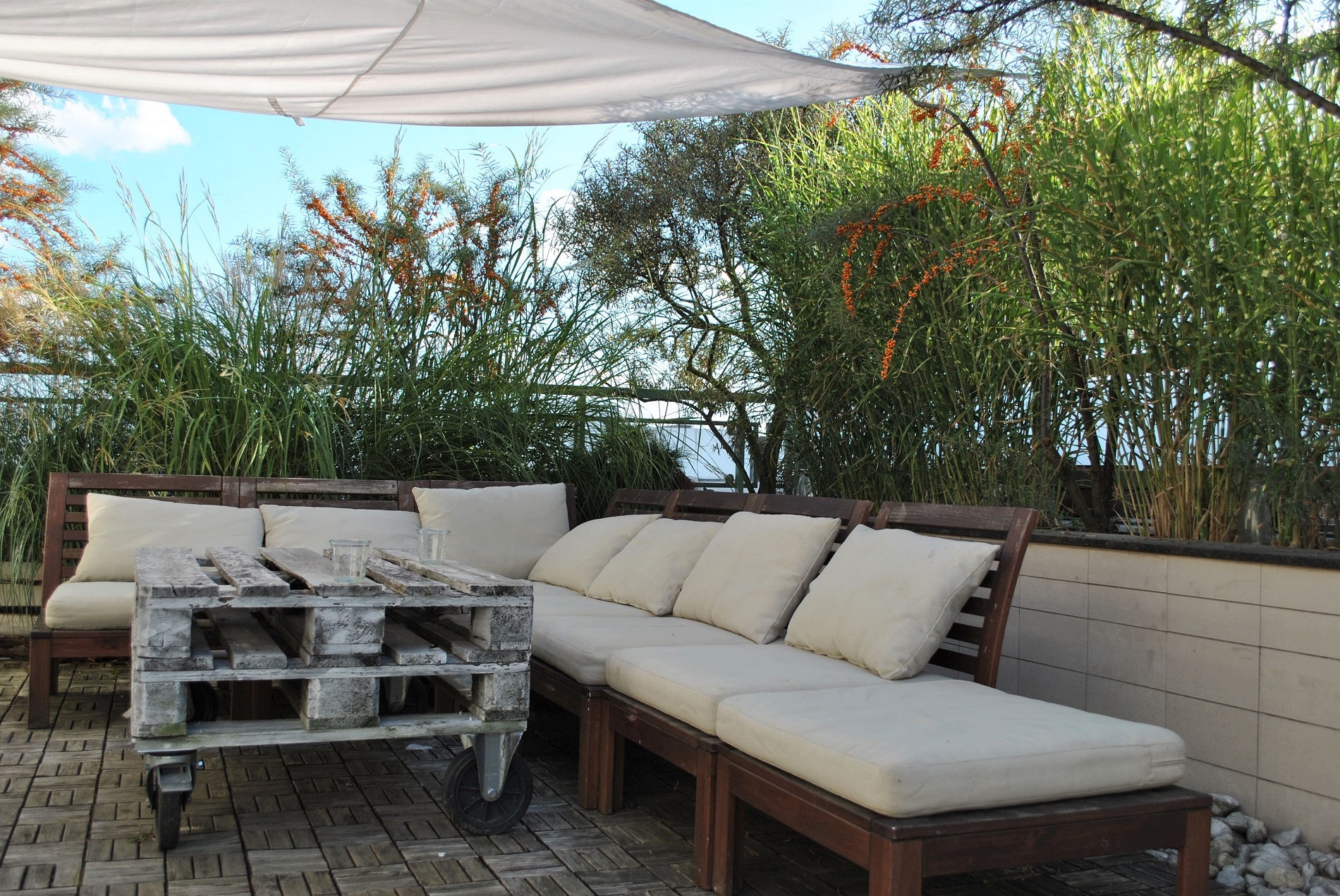 Szumiące trawy, wyblakłe i wypłowiałe deski podłogowe, łopoczące na wietrze żagle ocieniające taras...